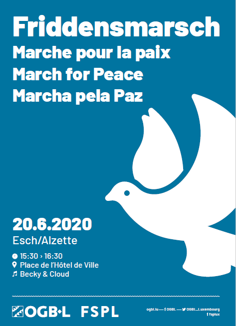 Por causa da pandemia da Covid-19, a central sindical OGBL e a FSPL (Friddens- a Solidaritéitsplattform Lëtzebuerg, i.e. Plataforma para a Paz e a Solidariedade do Luxemburgo) tiveram de adiar a edição 2020 da Marcha da Paz para o sábado, 20 de junho de 2020, dia em que a ONU assinala o Dia Mundial do Refugiado das Nações Unidas. A Marcha pela Paz 2020 terá lugar em Esch-sur-Alzette, na Place de l’Hôtel de Ville, com início previsto para as 15h30.