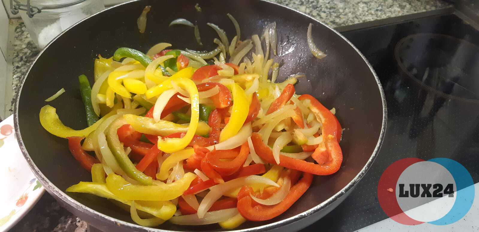 - Entretanto, lave e arranje os pimentos, cortando-os em tiras e reserve.