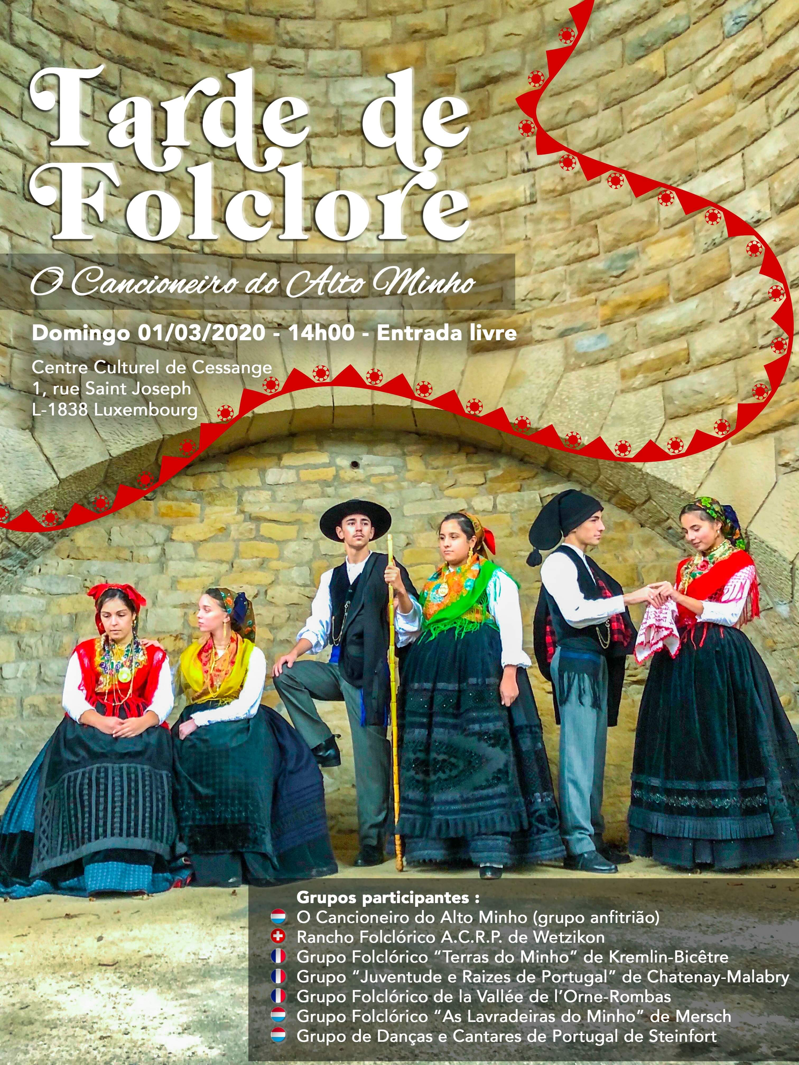 No âmbito do seu 6° aniversário, O Cancioneiro do Alto Minho organiza uma Tarde de Folclore, no dia 01 de Março de 2020, pelas 14:00, no Centre Culturel de Cessange [1, rue Saint-Joseph, L-1838 Luxembourg], na cidade do Luxemburgo.