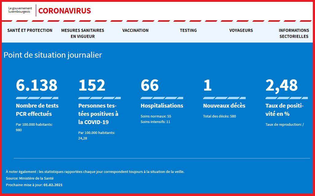 Ponto da situação do Coronavírus Covid-19 no Luxemburgo relativo às últimas 24 horas, 31.01.2021 - FONTE Ministério da Saúde